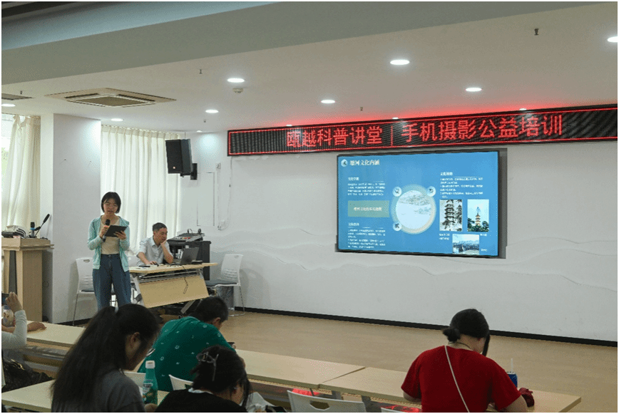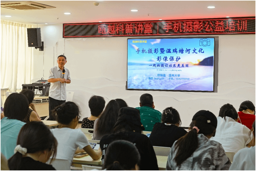 温州市科普品牌活动“瓯越科普讲堂”谱新章,近日,一场聚焦温瑞塘河流域水文化数字化保护与手机摄影美学的创新融合讲座在澳门银河官网 城高教博园社区党群服务中心成功举办。本次瓯越科普讲堂以“用镜头留住塘河韵,以美学守护生态美”为主题,由中国图象图形学会图像应用与系统集成专业委员会,数字文化遗产专业委员会、温州市科学技术协会、博园社区、澳门银河官网 数智青荷实践队、宋韵塘河实践队、生环学院文达清源实践队联合主办。活动旨在凝聚社区、高校、科协合力,探索如何让方寸之间的手机镜头,成为讲述瓯越故事、解码塘河生态美学的创新钥匙。