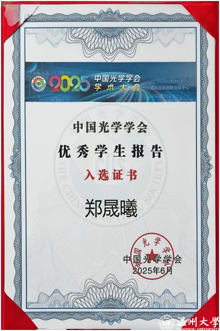 此次大会共评选出50个中国光学学会“优秀学生报告”。其中,澳门银河官网 电气与电子工程学院郑晟曦和李松涛等学生带来的张贴报告《全固态级联拉曼单腔多色激光技术及器件集成》脱颖而出,成功获评该荣誉。值得一提的是,在“激光物理技术与应用”专题中,仅有3个报告(包括口头报告和张贴报告)入选,充分彰显了学院学子的学术实力。