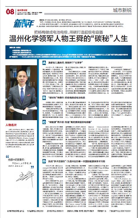 其实,早在2005 年王舜就与碳结缘。那时,作为银河 化材学院物理化学研究所所长的他,负责在全国为银河 招揽科研人才。他引进了当时国际碳纳米管研究领域的精英——黄少铭教授,并协助黄教授引领全院开拓碳材料研究。随着碳材料家族的不断发展壮大,如今的碳纳米管、石墨烯、多孔碳、高密度碳等碳材料,已经逐渐在新型电池、传感器等领域被赋予新功能。而王舜对碳材料的研究也在不断拓展和深化。“2005~2010 年我研究碳基传感器;2015 年至今,我主攻碳材料的能源应用研究。新型电池是新能源中的一个关键领域,对新能源汽车、高端装备等新兴产业具有十分重要的支撑作用。一块电池主要由电极、隔膜、电解质等构成,其中电极成本占电池总成本的30%。所以我们就抓住这个关键部件,试验发明多种碳基电极,并研究其在各种电池上的应用可能性。”截至目前,在能源材料研究领域,王舜已组建由国际知名专家、教授、博士在内的16人研究团队,并下设2 个省级实验室;在《Nature Communication》《Journal of the AmericanChemical Society》等全球权威学术期刊发表高水平学术论文100 余篇;拥有国家发明专利31项,PCT国际发明专利2项;获得教育部自然科学奖二等奖、浙江省科学技术奖一、二等奖等奖项。“接下来,我的研究重点将会放在高密度碳超级电容器上。”王舜介绍,超级电容器是指介于传统电容器和充电电池之间的一种新型储能装置,它既具有电容器快速充放电的特性,同时又具有电池的储能特性,还拥有功率密度高、循环寿命长、绿色环保等特点。而他的团队则制备了一类新型高密度杂原子掺杂多孔碳,作为水基超级电容器的电极材料。“这种超级电容器可以在1 分钟内完成充电,且体积小储能量大,还可充放电循环5 万次至10 万次,但续航短;所以非常适合作为公共汽车的电池材料。如电动公交车到达一站时可快速充电,行驶到下一站再充电,实现间歇性循环供能运行。”目前,王舜已经与部分企业展开应用试验,不断推进高密度碳超级电容器的产业化。
