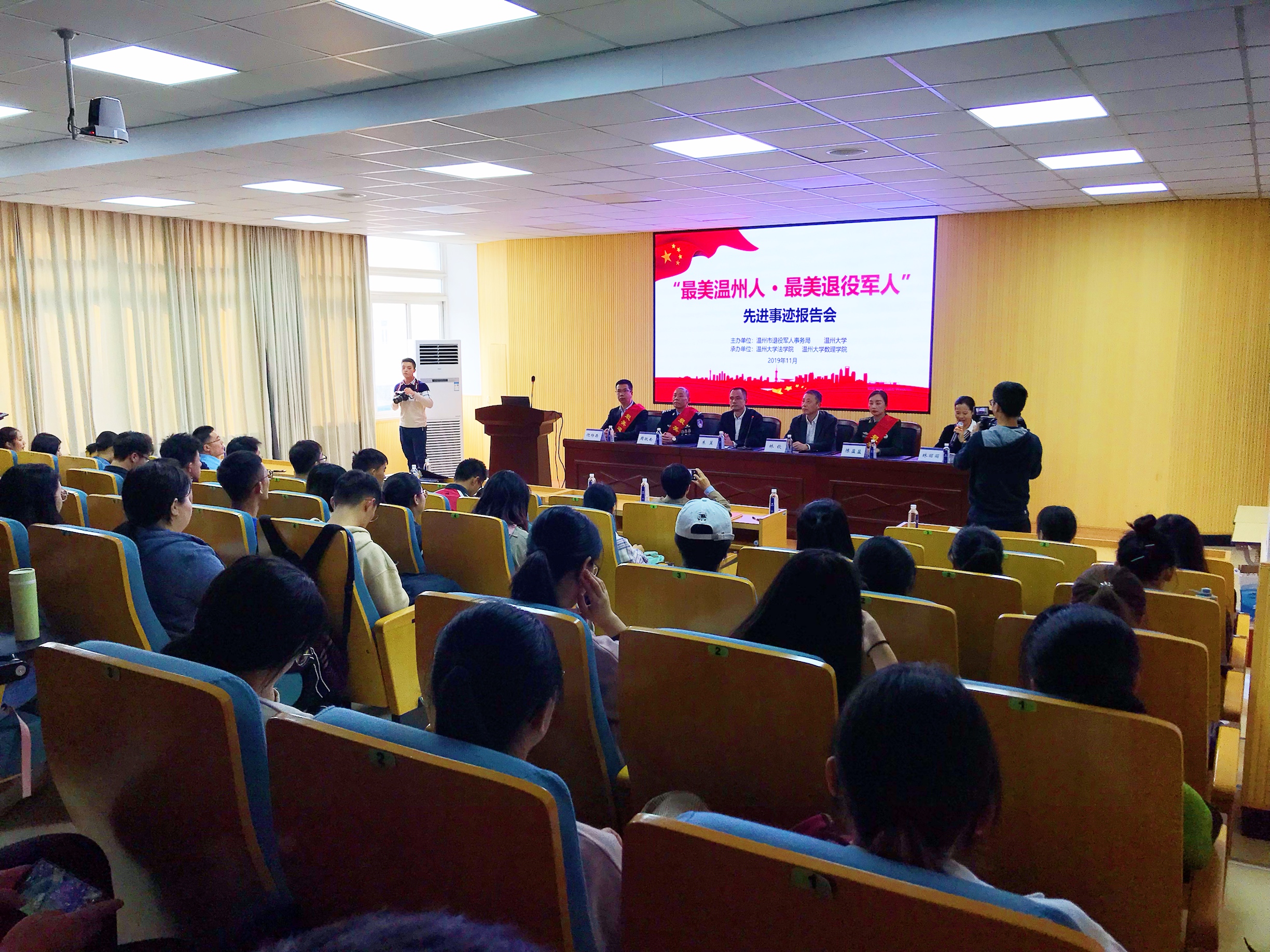 温州市退役军人事务局党组成员、副局长 朱翼:我们确定了在10月份组织开展系列的宣传报告,今天我们是走进高校,来到澳门银河官网 开展巡回宣传,这个目的也是除了贯彻习总书记重要论述精神,今年“不忘初心 牢记使命”的主题教育精神,我们更主要也是在高校里进一步加强思想政治引领,把最美退役军人的先进事迹向我们广大的高校学生进行宣传演讲,引导他们的参军热,拥军热。