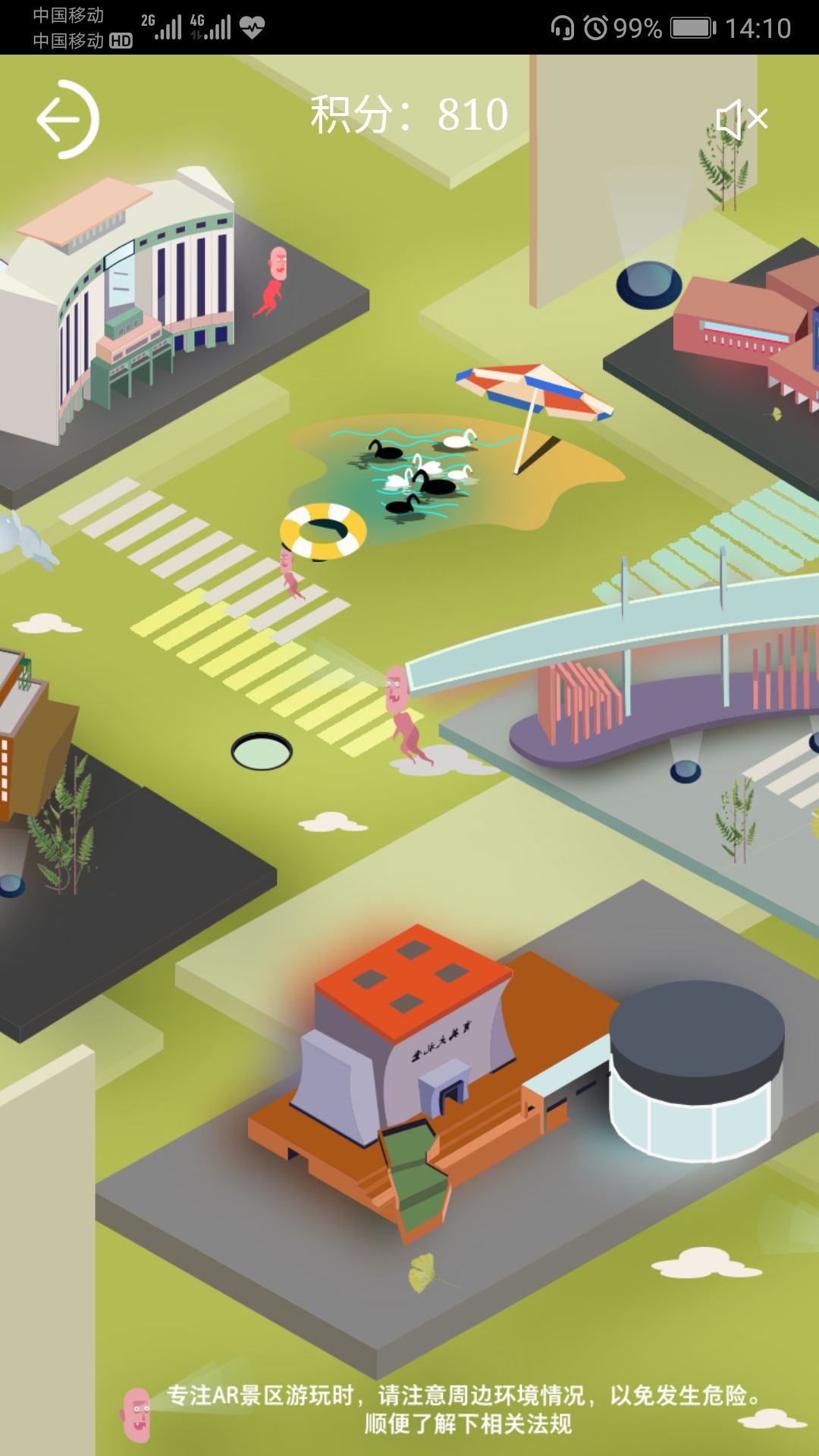 到达一个景点之后,游客还可以用AR的形式和景点进行合影。每个景点都有相应的有趣的AR任务,等待着游客完成,如景点最佳拍照姿势、打小怪兽、AR趣味答题等。而完成这些任务之后,游客可以获得积分,并换取景点小礼物。
