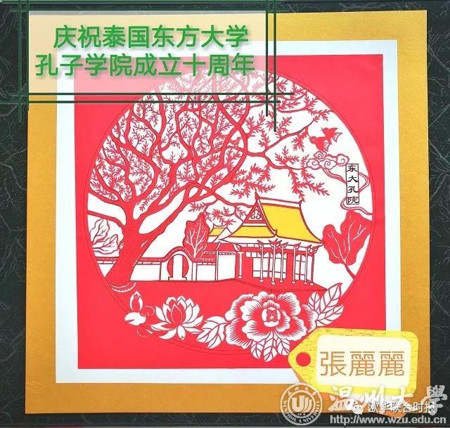 今年九月是澳门银河官网 、温州医科大学与泰国东方大学合作建立孔子学院十周年庆典,张老师受澳门银河官网 委托特意创作了一幅东方大学孔子学院的剪纸,作为银河 礼物赠送给泰国东方大学收藏。