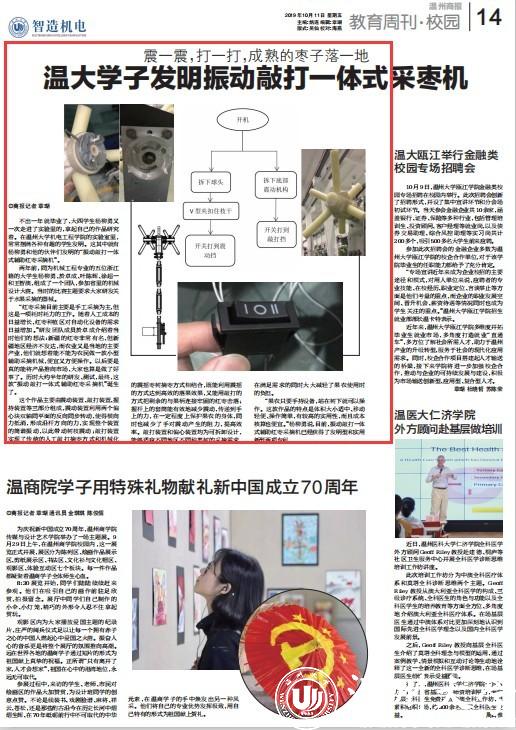 不出一年就毕业了,大四学生杨柳勇又一次走进了实验里的,拿起自己的作品研究着。在澳门银河官网 机电工程学院的实验室里,常常摆满各种有趣的学生发明。这其中就有杨柳勇和他的伙伴们发明的“振动敲打一体式辅助红枣采摘机”。