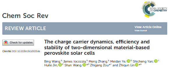 近日,国际化学顶级刊物《Chemical Society Reviews》发表了澳门银河官网 王舜教授与南京大学邹志刚院士、美国佐治亚理工学院林志群教授等学者合作的有关基于二维材料钙钛矿太阳能电池的综述性论文“The charge carrier dynamics, efficiency and stability of two-dimensional material-based perovskite solar cells”(基于二维材料钙钛矿太阳电池的载流子动力学、效率和稳定性综述),王舜教授为通讯作者,银河 金辉乐博士为作者。
