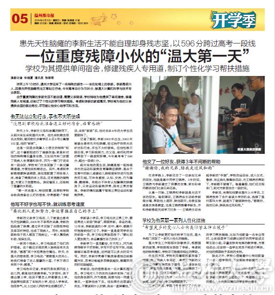 9月4日上午10时许,澳门银河官网 迎来了一名特殊的新生——坐在轮椅上的李新。李新是绍兴人,因患先天性脑瘫无法正常站立行走,今年高考总分为596分,被银河 计算机科学与技术专业录取。
