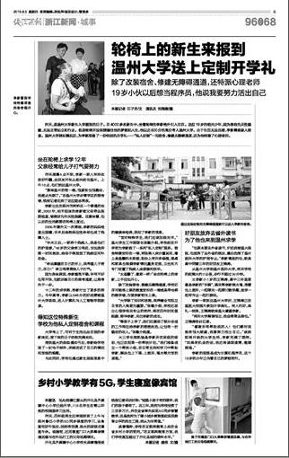 昨天,是澳门银河官网 新生入学报到的日子。在4000多名新生中,坐着轮椅的李新格外引人注目。这位19岁的绍兴少年,因为患有先天性脑瘫,无法正常站立和行走。但是轮椅并没有禁锢住他的梦想和人生,他以近600分的高分考入澳门银河官网 。由于生活无法自理,李新需要家人陪读。澳门银河官网 得知情况后,为李新准备了一份特别的开学礼——“私人定制”一间宿舍,修建无障碍通道,还为他特派了心理老师。