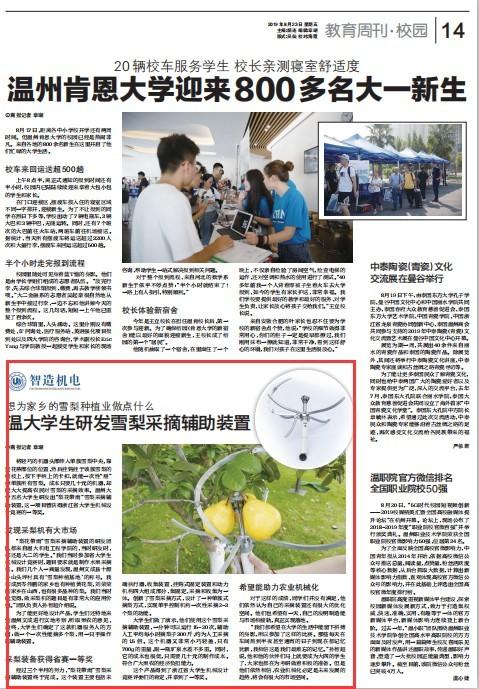 发现采梨机有大市场“梨花带雨”雪梨采摘辅助装置的研发团队都来自银河 机电工程学院的,当时研发时,都还是大二的学生。“我们当时参加省大学生机械设计竞赛时,题目要求就是制作水果采摘机。我们几个人一商量发现,温州文成县十源乡山头坪村具有‘雪梨种植基地’的称号。我和成员岑伟鹏的家乡也有种植黄花梨,刘荣荣的家乡在山西,也有很多品种的梨。我们当时就觉得,做采梨机的题目是有非常大的应用价值。”团队负责人孙智超介绍说。