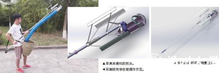 在水果市场中,唯一的“常青树”型水果应该就是苹果了。可是,苹果好吃,采摘却不是那么方便。于是,澳门银河官网 机电工程学院的几位大学生针对这一情况研发制作了“辅助人工苹果采摘机”。这一发明获得了国家实用型新型专利和浙江省机械创新设计大赛三等奖的荣誉。