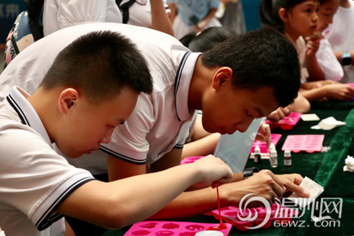 手工皂制作、隐形墨水写字、星空瓶和香薰制作等趣味化学小实验被实践队员带入郭公山社区。在活动开始前,便有许多的家长和孩子来到游园,每个人都对举行的小活动兴趣十足。“姐姐,这个怎么弄?这个应该怎么做?这个什么时候可以好……”所有的小朋友都热情地参与活动,同时实践队员们也耐心地帮助小朋友们认识活动并更好地参与进来。