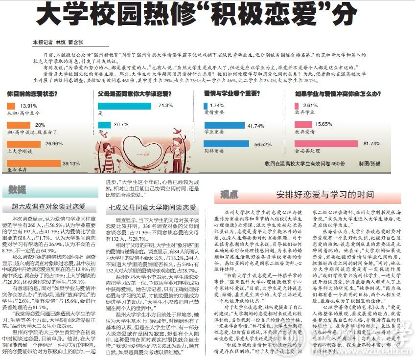 爱情是大澳门银河官网 园文化的重要主题。那么,大学生对大学期间谈恋爱持什么态度?他们如何处理学习和恋爱之间的关系?为此,记者面向在温高校大学生开展了网络问卷调查,共收回有效问卷460份,其中男生占25%,女生占75%;大一学生占46%,大二学生占23.4%,大三学生占28.7%。