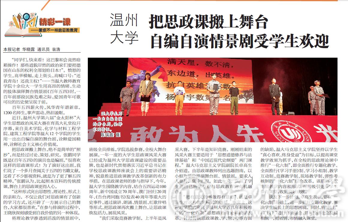 “我们采取竞赛教学制,上半年是风采大赛,下半年是知识竞赛。刚刚结束的风采大赛主要适用于‘思想道德修养与法律基础’和‘中国近现代史纲要’两门课程。”银河 马克思主义学院副院长卓高生介绍道,由思政课教师列出选题指南,以小组为单位排演舞台剧、情景剧。要求人人参与,集中汇报。如此一来,实现了学生把自己所学专业与思政教育的有机融合。