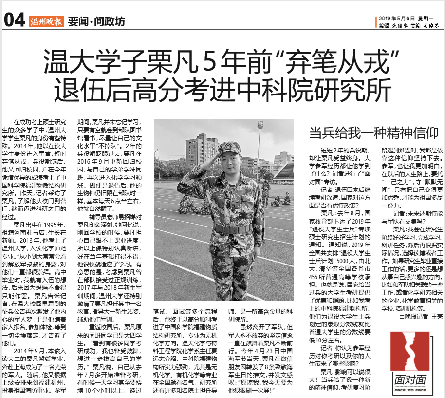 在成功考上硕士研究生的众多学子中,澳门银河官网 学生栗凡的身份有些特殊。2014年,他以在读大学生身份进入军营,暂时弃笔从戎。兵役期满后,他又回归校园,并在今年凭借优异的成绩考上了中国科学院福建物质结构研究所。昨天,记者采访了栗凡,了解他从校门到营门,继而迈进科研之门的经过。