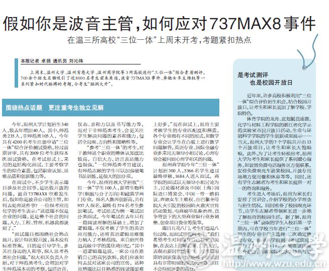 上周末,澳门银河官网 、温州肯恩大学、温州商学院等3所高校进行“三位一体”综合素质测评,700余个招生名额吸引了近8000名考生前来角逐,波音737MAX8事件、奔驰女车主维权等一系列紧扣时代脉搏的考题,令考生“脑洞大开”。