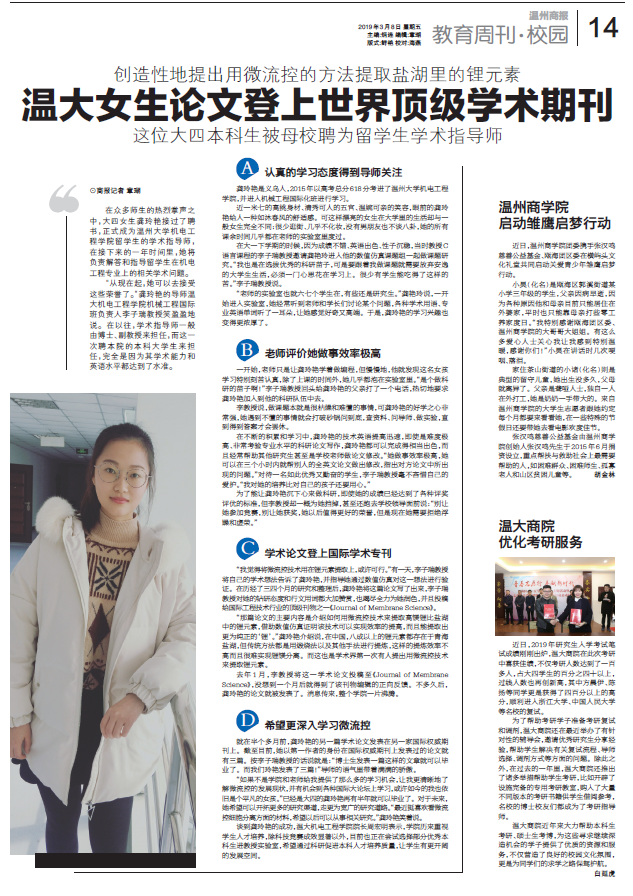 “我觉得将微流控技术用在锂元素提取上,或许可行。”有一天,李子瑞教授将自己的学术想法告诉了龚玲艳,并指导她通过数值仿真对这一想法进行验证。在历经了三四个月的研究和整理后,龚玲艳将这篇论文写了出来,李子瑞教授对她的钻研态度和行文用词都大加赞赏,也竭尽全力为她润色,并且投稿给国际工程技术行业的顶级刊物之一《Journal of Membrane Science》。“那篇论文的主要内容是介绍如何用微流控技术来提取高镁锂比盐湖中的锂元素,借助数值仿真证明该技术可以实现效率的提高,而且能提取出更为纯正的‘锂’。”龚玲艳介绍说,在中国,八成以上的锂元素都存在于青海盐湖,但传统方法都是用煅烧法以及其他手法进行提炼,这样的提炼效率不高而且很难实现锂镁分离。而这也是学术界第一次有人提出用微流控技术来提取锂元素。去年 1 月,李教授将这一学术论文投稿至《Journal of Membrane Science》,没想到一个月后就得到了该刊物编辑的正向反馈。不多久后,龚玲艳的论文就被发表了。消息传来,整个学院一片沸腾。