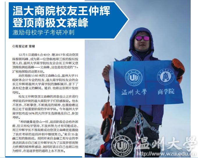 “考研就像是登山一样,最后阶段总会格外困难,但只有咬牙坚持,不放弃努力才有可能成功,而王仲辉学长不畏艰难成功登顶文森峰更是激励了我在考研的最后冲刺中继续努力。”来自15金融工程的陈扬说。而同样来自金融工程专业的李圣洁则表示自己被王仲辉学长为了实现梦想而努力拼搏的精神所感动,她同时表示自己也将以他为榜样,在追逐梦想的道路上永不言弃。
