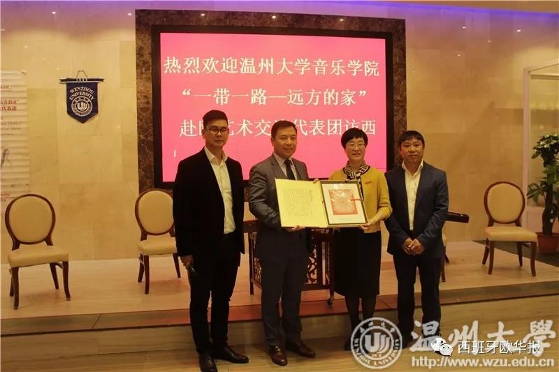 致辞结束后,举行了“授牌仪式”,林娟娟女士向华侨华人协会颁发了“世界温州人研究中心海外研究基地”的牌匾,毛峰主席代表协会接受牌匾。同时,西班牙华侨华人协会常务副主席孙小敏先生代表协会向澳门银河官网 赠送了礼物。