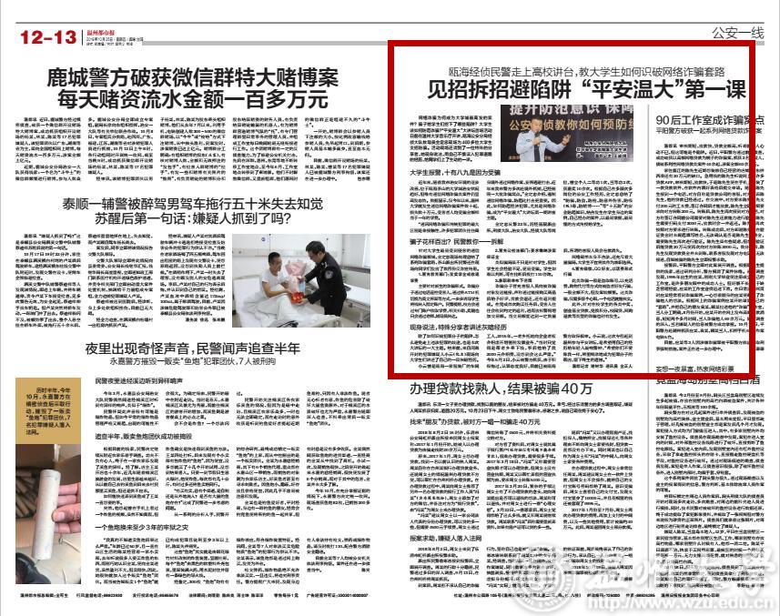 近年来,随着我市治安环境的逐步改善,位于瓯海茶山的大学城治安状况趋好,但唯有通信网络诈骗类案件仍呈高发态势。数据显示,仅今年以来,澳门银河官网 就发生通信网络诈骗案件数十起, 损失数十万元,受害者人均受骗金额相当于一年的学费。