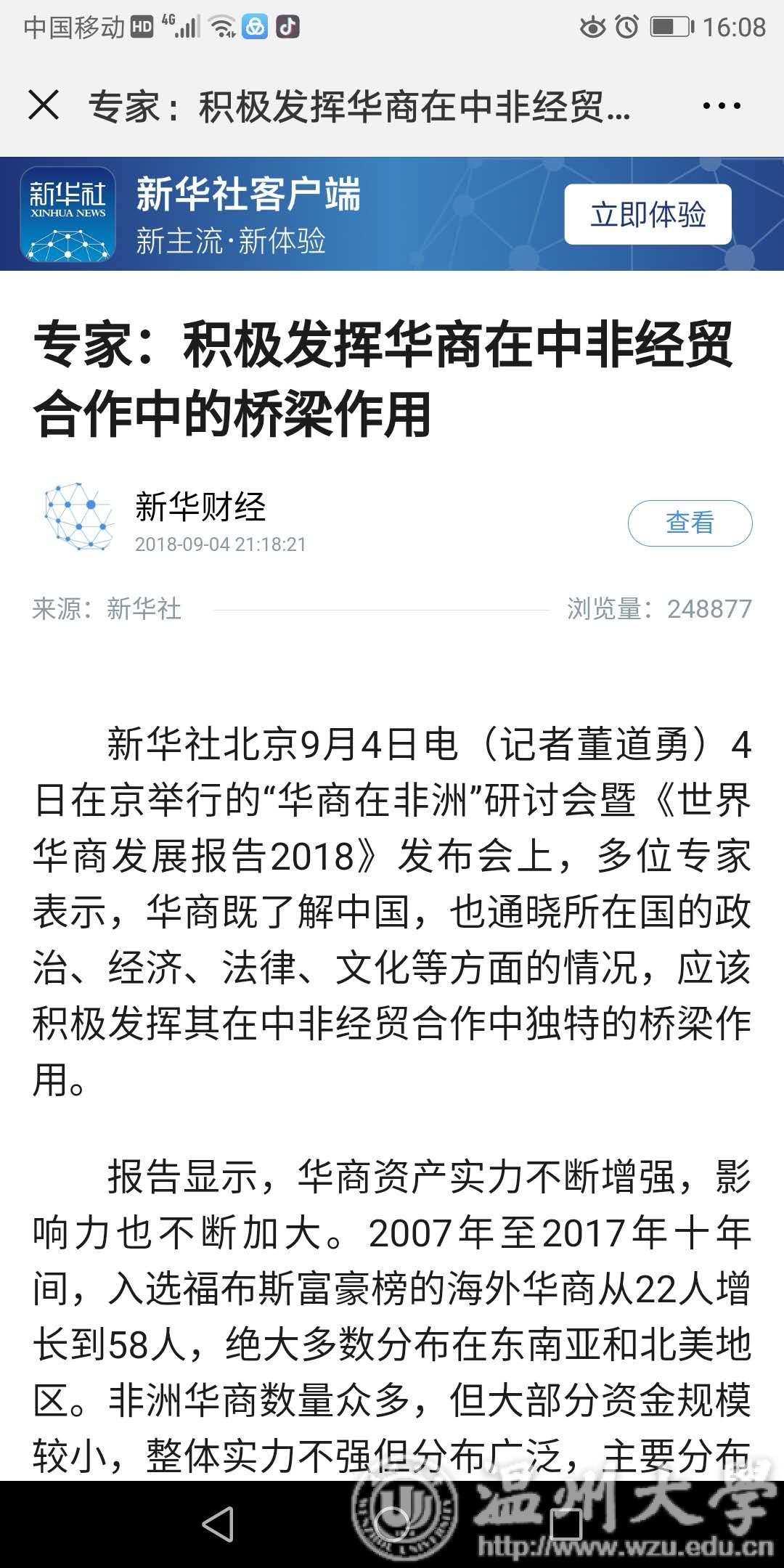 新华社北京9月4日电(记者董道勇)4日在京举行的“华商在非洲”研讨会暨《世界华商发展报告2018》发布会上,多位专家表示,华商既了解中国,也通晓所在国的政治、经济、法律、文化等方面的情况,应该积极发挥其在中非经贸合作中独特的桥梁作用。