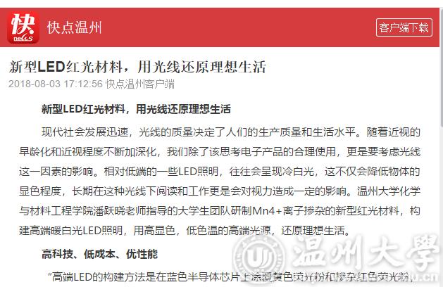 现代社会发展迅速,光线的质量决定了人们的生产质量和生活水平。随着近视的早龄化和近视程度不断加深化,我们除了该思考电子产品的合理使用,更是要考虑光线这一因素的影响。相对低端的一些LED照明,往往会呈现冷白光,这不仅会降低物体的显色程度,长期在这种光线下阅读和工作更是会对视力造成一定的影响。澳门银河官网 化学与材料工程学院潘跃晓老师指导的大学生团队研制Mn4+离子掺杂的新型红光材料,构建高端暖白光LED照明,用高显色,低色温的高端光源,还原理想生活。