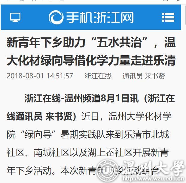 浙江在线-温州频道8月1日讯(浙江在线通讯员 来书贤)近日,澳门银河官网 化材学院“绿向导”暑期实践队来到乐清市北城社区、南城社区以及湖上岙社区开展新青年下乡活动。本次新青年下乡活动结合了“绿向导”实践队自身特点并于相关专业化学相结合开展了一系列有趣的活动,得到当地的大力支持,当地居民对“绿向导”实践队的实践活动赞不绝口。