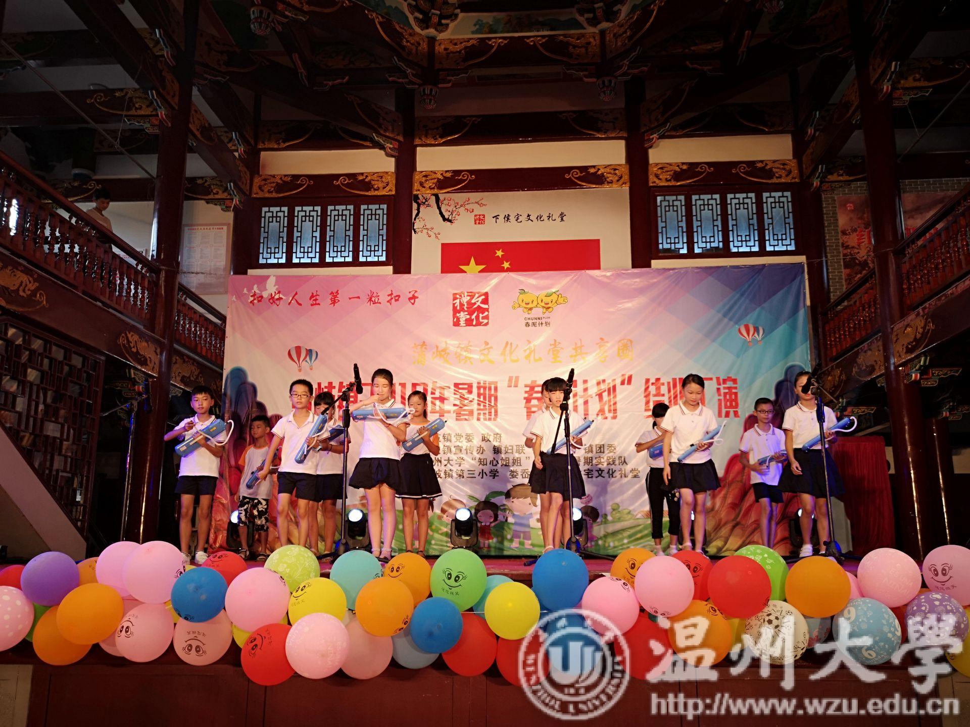 这一天,乐清市蒲岐镇文化礼堂被添上各种童真的色彩。幼升小启蒙礼、双人唱、讲故事、环保服装秀、儿童剧、三句半、儿歌串烧、杯子舞……这场由蒲岐三小、娄岙小学、蒲岐镇春泥班孩子呈现的演出,是由澳门银河官网 教师教育学院“知心姐姐”暑期实践队的成员编排组织,服装、道具均是出自成员之手。