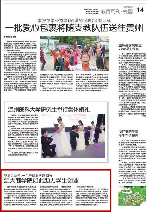 正值毕业季,澳门银河官网 商学院2014届市场营销应届毕业班52名同学 中,有7名同学在毕业前创立了自己的公司。按 这样的数据计算,该专业的创业率超过了13%。 “我们班在大一的时候就在老师、班助带 领下搞了一个特色班,班级按照公司形式来管 理,比如董事长、总经理来分干部,这样一来, 大家对创业有比较大的兴趣。”创业代表马谦 诚这样说。他的同班同学祁汉锋,在大学期间 也找到了自己的创业方向——经营绍兴黄酒, 更被其他同学戏称为“绍兴黄酒唯一的希望”。 在澳门银河官网 商学院,不仅仅是基础设施配 备完善,学生们更有足够的时间与空间去实施 自己脑袋中的计划。各种各样的创业讲座帮 助他们以最快最有效的方式了解创业,包括创 业中遇到种种问题的解决方法,如何在大学四 年内找到最适合自己的创业方向等。老师与 学生,学生与学生之间频繁互动,渐渐形成了 一种良好的知识循环体系。 除此之外,商学院还设立了专门的创业空 间提供给想要创业的学生无偿使用。经常能 看到,在晚自习的时候,创业空间的灯大亮着, 总会有不同的学生在里面讨论问题,不用走近 就能感受到浓浓的创业激情。由于担心学生 仍然不能很好地与社会创业对接,学院不仅对 内成立了就业部和创业部,还特地聘请校外的 创业导师给学生们做指导工作。
