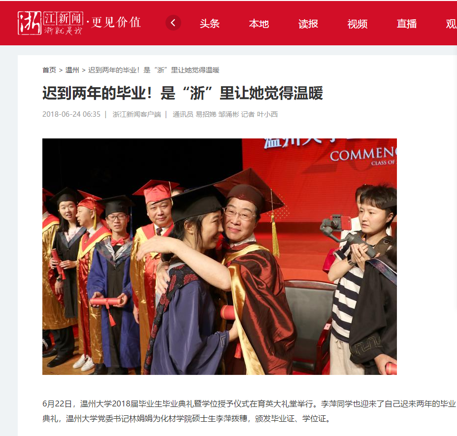 “这个学位证是对我学业上多年努力的肯定,也是我人生中最浓墨重彩的一笔。”拿到学位证书的李萍很是激动。为了能够顺利完成答辩,李萍提前3个月准备毕业论文和答辩书面材料,而澳门银河官网 考虑到她情况特殊,特批通过视频完成答辩。“我很感谢澳门银河官网 老师和同学们对我的关心和帮助,没有你们就没有我的重获新生,真的很庆幸,我来的是浙江温州,读的是银河 ,‘浙’里让我觉得很温暖!”
