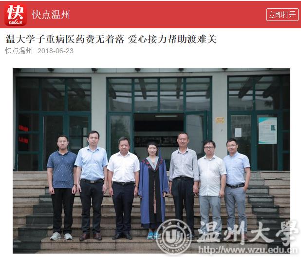 此后,长达两年的时间,既是李萍与病魔抗争的时间,亦是银河 师生接力陪跑的时间。银河 师生成立了“萍生救助团队”,联系温州都市报、温州市红十字会、银河 校友会等社会力量积极募捐,并通过“轻松筹”、亲青筹等平台发起网络爱心募捐,一时间,为李萍捐款的消息瞬间刷爆了朋友圈和空间。91岁高龄的澳门银河官网 原党委书记李方华从报纸上看到李萍的消息当即决定捐赠3万元。最终,学院澳门银河官网 师生及个人、银河 校友会、瓯海慈善总会、市红十字会、张汉鸣基金以及爱心市民为李萍募集善款,共计36万元。