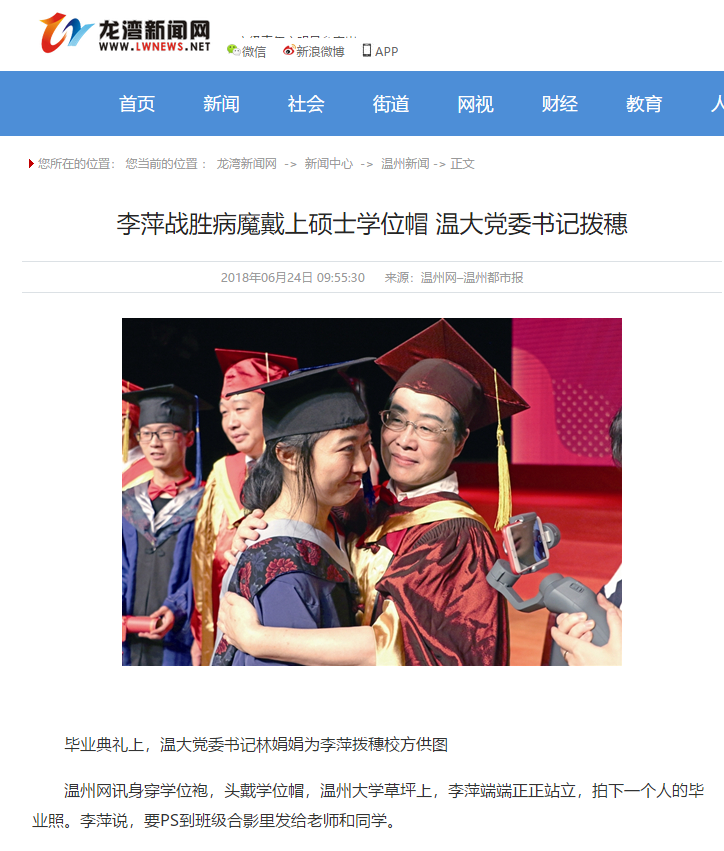 下午1时,毕业典礼开始,李萍父女一进会场,李萍就被同学带去了中间第一排位置。在这届毕业典礼上,学姐李萍可是位特殊人物,她的名字被3次提起:澳门银河官网 党委书记林娟娟在致辞中提到各位优秀学生,其中李萍是坚强战胜病魔完成学业的;毕业生代表余书玲在发言中透露,没有生病前,李萍一直有读博的愿望;主持人请毕业生上台接受拨穗时,特意加了一句,请战胜病魔不轻言放弃的李萍同学。