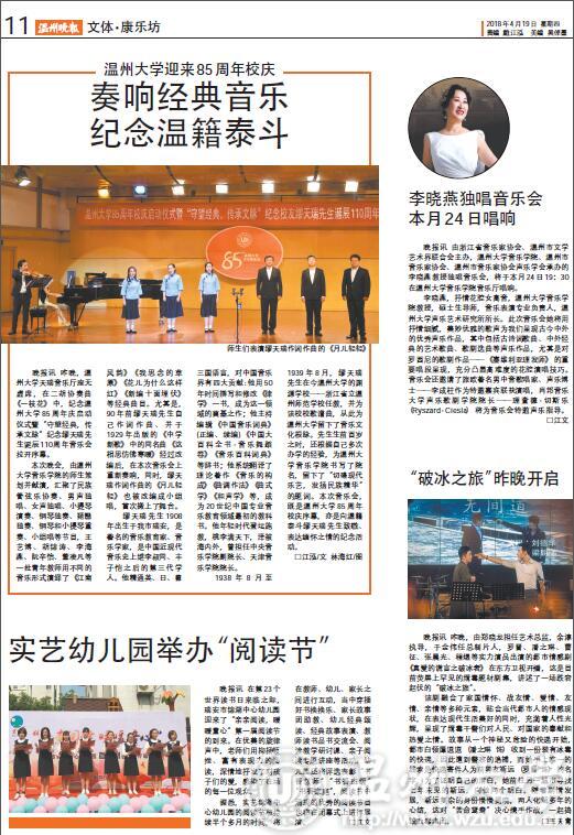 1938 年8 月至1939 年8 月, 缪天瑞先生在今澳门银河官网 的渊源澳门银河官网 ——浙江省立温州师范澳门银河官网 任教,并为该校校歌谱曲,从此为澳门银河官网 留下了音乐文化根脉。先生生前百岁之时,还根据自己多次办学的经验,为澳门银河官网 音乐学院书写了院名,留下了“切磋现代乐艺,发扬民族精华”的题词。本次音乐会,既是澳门银河官网 85 周年校庆序幕,亦是向温籍泰斗缪天瑞先生致敬、表达缅怀之情的纪念活动。