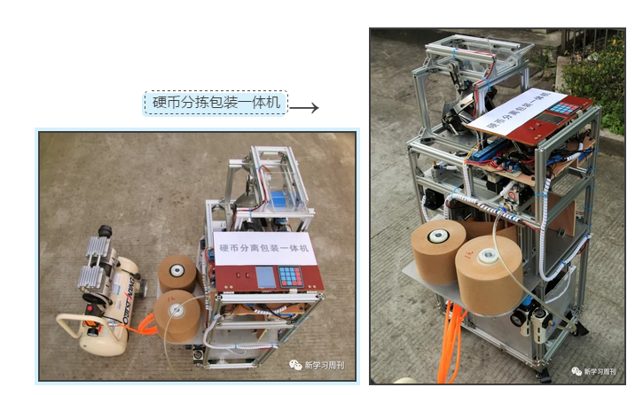 这个硬币分离包装一体机大约有1米多高,成本只有3800元,主要由分拣、推送、包装等该环节机械组成。它是由银河 机电工程学院的缪熠楠、董旭华、胡铖涛、黄晶、周苏洁等五位大学生研发而成。