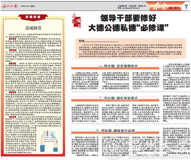 3月10日上午,习近平总书记在参加十三届全国人大一次会议重庆代表团审议时指出:“领导干部要讲政德,政德是整个社会道德 建设的风向标。立政德,就要明大德、守公德、严私德”。总书记的重要讲话,既是对中国优秀传统文化的经验总结,也是对治党治国规 律的深刻把握,再次对新时代建设风清气正政治生态发出了动员令,有着极为深刻的指导意义。 领导干部是中国特色社会主义大厦的“四梁八柱”,也是推动党的方针政策落实落地的“领头雁”,是锻造优良党风政风民风、确保社 会主义现代化强国建设目标顺利实现的重要保障。贯彻落实总书记的教导,各级领导干部就要修好大德、公德、私德这一人生必修课, 自觉弘扬党的优良作风,践行社会主义核心价值观,择其善者而从之,做到心有所畏、言有所戒、行有所止。