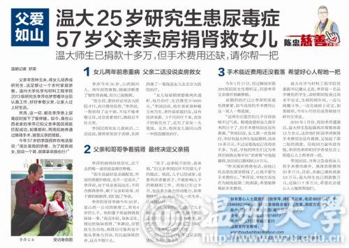两年前的寒假,李萍从温州返乡的路上,晕倒在街头,送医抢救被诊断为患有慢性肾衰竭,而且已是晚期。