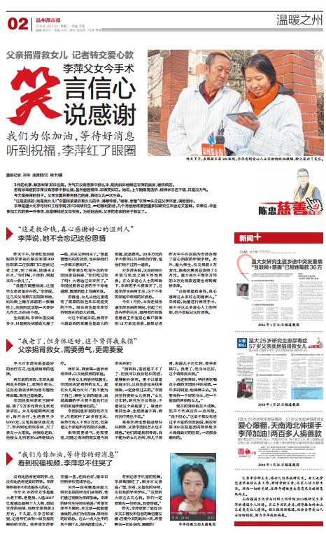 “这些都是救命钱,真心感谢这么多好心的温州人。”李萍说,她能进行换肾手术,离不开这么多爱心人士的帮助,她不会忘记这份恩情。