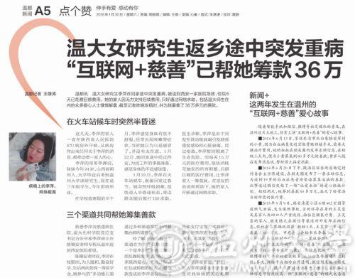 今年1月份,本报连续报道李萍患病的情况,引起了社会各界的关注,温州都市报陈忠慈善工作室爱心账户募集到13万余元善款,温都记者昨天中午在医院为李萍办理了爱心捐款的申领手续。此外,银河 师生、校友捐款6万余元,瓯海区慈善总会捐了3万元。银河 离休干部李方华的3万元捐款近期也将转账给李萍。