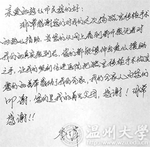 面对从四面八方涌来的爱心,李萍特地写了一段话,表达感激之情:“亲爱的热心市民你们好!非常感谢你们对我们这次器官移植手术的热心捐助……你们的善举感动了我们全家,我们全家人向您们叩谢,你们是我的再生父母,感谢!非常感谢!”