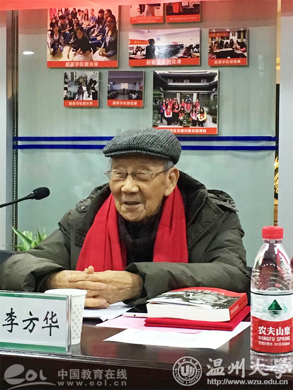92岁高龄的李方华书记原温州师范学院党委书记,退休后一直心系教育,关爱大学生成长。作为一名党员,他捐资助学的事迹一直深深地感动着每一名银河 师生,以自己实际行动践行共产党员的使命和担当。作为学生党支部的引领导师,他当天特别准备了一堂生动的党课,向在座的学生党员和入党积极分子讲述了第一部党章“神秘守护人”张人亚的故事,阐述了什么是一个共产党员的“初心”。他说:“入党就是要一生一世为人民服务,中国共产党人的初心和使命就是为中国人民谋幸福,为中华民族谋复兴,实现伟大的中国梦。”