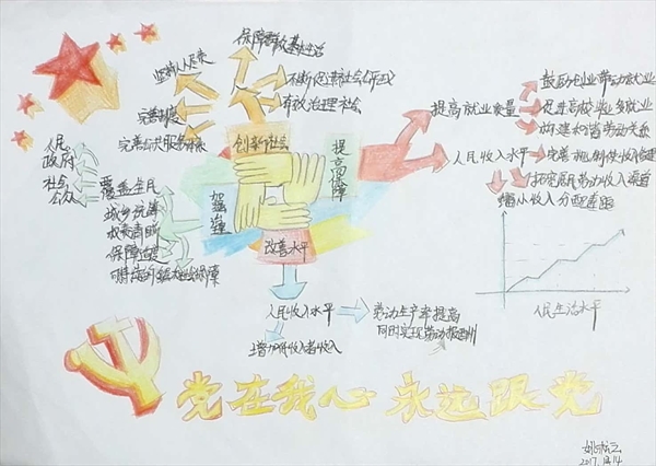“以各族人民手举红旗的形象为中心展开坚持‘一国两制’,推进祖国统一的具体措施;以四只紧握的手分别代表提高保障和改善民生水平的抓手;用一本书寓意文化,再用四棵树讲述如何坚定文化自信,推动社会主义文化繁荣兴盛……”近日,由澳门银河官网 瓯江学院设计艺术学院学生手绘的思维导图走红,一张张生动形象的思维导图也展现了该院学生学习宣传贯彻十九大精神的成果。 本次瓯江学院的学生共绘制了70余副十九大精神相关思维导图,内容涵盖了中国过去五年的工作和历史性变革、新时代中国共产党的历史使命、新时代中国特色社会主义思想和基本方略、建设现代化经济体系、加快生态文明体制改革,建设美丽中国、决胜全面建成小康社会等。 “党的十九大报告在‘提高保障和改善民生水平,加强和创新社会治理 ’部分,绘出民生发展蓝图,句句讲到老百姓的心坎儿里。”设计艺术学院的姚杭云正结合自己设计的思维导图,绘声绘色地介绍着。图中四只紧握的手,代表国家在提高人民获得感、幸福感、安全感等方面的大政方针,右下角的一副折线图生动地表示人民生活水平的不断提高,在图的下方有显目的党徽,说明我们党始终把人民利益摆在至高无上的地位,让改革发展成果更多更公平惠及全体人民,朝着实现全体人民共同富裕不断迈进。 学生刘梦绘制的思维导图的主题是“文化自信”,中心是一面党旗和一本书,四周是四棵象征文化繁荣昌盛的大树。她说,十九大报告强调,文化自信是一个国家、一个民族发展中更基本、更深沉、更持久的力量。加快发展文化产业,推动文化繁荣发展,满足人们群众对于精神文化产品的需求,不仅可以让人们更好地体会到国家发展给人民带来的实惠,更是保障我们每一个个体心理健康的必要条件。“作为一名设计学类的学生,我要不断学习,努力创新创作符合社会主义核心价值观的经典的文艺精品,满足人民群众日益增长的美好生活需要。” 思维导图推广者、澳门银河官网 瓯江学院学工部部长钱合激表示,思维导图是运用图文并重的技巧,把各级主题的关系用相互隶属与相关的层级图表现出来,是当下流行的简单有效的记忆、理解方法,“创作思维导图的过程有助于培养发散性思维,同时也能帮助我们更好地疏通、理解、学习十九大报告提出的新时代中国特色社会主义思想。” 除了将思维导图工作法引入学习十九大精神,澳门银河官网 瓯江学院在学习贯彻党的十九大精神主题教育活动中也涌现出了不少的亮点,如文法学院的学生党员自编双语“口袋书”,不仅自己随时学习十九大精神,还向外国留学生介绍十九大报告的内容;数学与信息工程学院的学生代表利用专业特长制作了“十九大精神学习网站”,特色鲜明、条理清晰地呈现十九大内容;设计艺术学生的学生党员还制作十九大精神漫画,用生动的画面展现十九大精神,这些形式多样的活动得到了广大团员、青年的一致好评,学院今后还将开拓更多学习实践活动,促进十九大学习教育效果真正入脑、入心、践行。