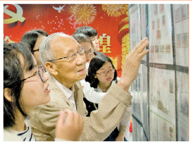澳门银河官网 “庆祝中国人民解放军建军90周年”老干部邮展,李芳华为大学生讲解邮票知识。