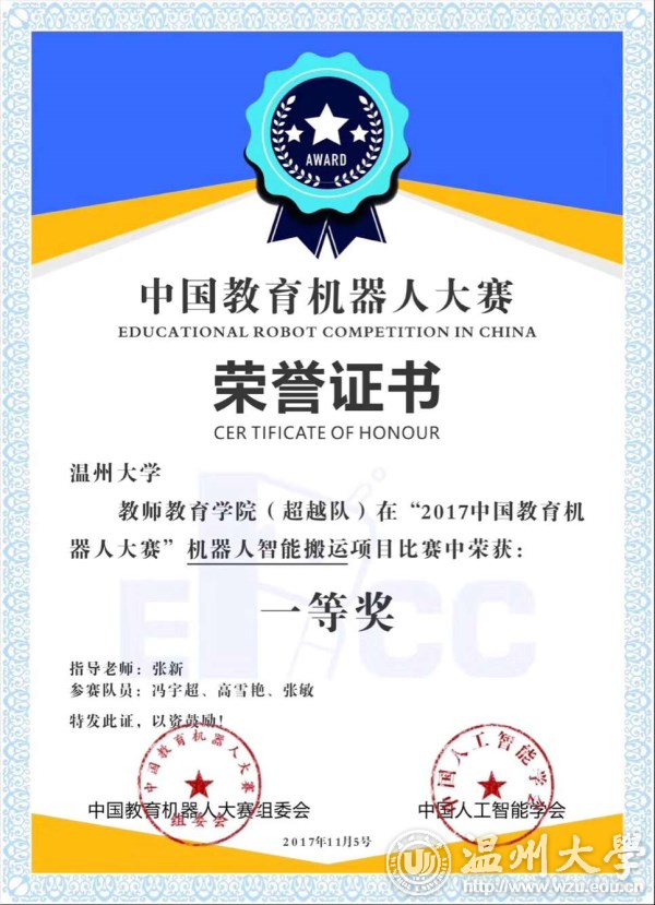 赛场上总是充满了挑战,组装后的机器人小车在多次更换颜色传感器以及一遍遍地拆线检查排除了各种可能的干扰后,终于小车平稳地按照预设路线开始工作,顺利完成各个物块的搬运任务。最终由银河 教师教育学院张新老师指导的学生高雪艳、张敏、冯宇超组建的超越队从60多支队伍中脱颖而出,在机器人智能搬运比赛项目中荣获一等奖。银河 学子在教育机器人大赛中匠心独具、从容应对、斩获佳绩,得益于学院小学教育专业和教育技术专业在人才培养中的交互融合和实践应用,同时也得益于学院以专业工作坊为载体,建立师生成长共同体,促进专业教学相长。澳门银河官网 教师教育学院小学教育专业是浙江省高校“十三五”优势专业和省教学改革试验区,教育技术专业是浙江省重点专业和省新兴特色专业,学院拥有浙江省实验教学示范中心。