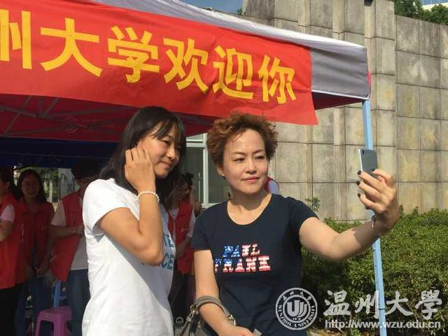 ▲45岁的吴静春和15岁的杨尚萍在迎新点自拍,两人分别是今年年纪最大和最小的大一新生,也打破了澳门银河官网 年龄最大和最小新生记录。