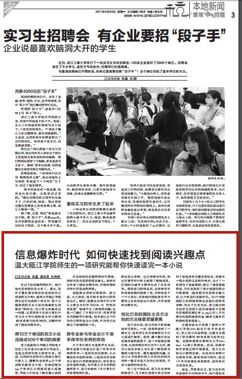 在这个信息爆炸的时代,我们每天看到的信息太多了,那么,怎样才能从繁杂的信息里找到自己想读的文字呢?澳门银河官网 瓯江学院师生近日完成的一项名为“基于主题建模的文本小说自动摘要生成算法”的研究,可以帮大家解决这一问题,这项成果不仅被计算机科学与技术学科国际著名学术期刊《专家系统与应用》刊发,还顺利申请了国家发明专利。 将10万个单词的英文小说 压缩成500个单词的摘要 雷力是澳门银河官网 瓯江学院电子信息工程专业2016届本科毕业生,也是这项研究的主要研究者。他说,这项研究成果可以借助计算机代替人工,能够快速地将10万个单词的长篇英文小说,自动压缩为500个单词左右的高质量小说摘要,帮助人们快速了解长篇小说的内容梗概。 在互联网信息爆炸的时代背景,该研究具有重要的现实意义。该研究还申请了国家发明专利,并得到国家自然科学基金的资助。 说起搞这项研究的原因,雷力说,大三暑假,他开始考虑自己的毕业设计。那时,他刚从台湾中华大学以交换生身份学习归来,对“自然语言处理”领域产生了浓厚的兴趣:这是一门融汇了计算机科学、语言学等在内的跨学科领域。他考虑以这个作为自己的毕业设计方向,作为自己迈向这个领域的第一步。 跨专业参与毕业设计不易 幸得澳门银河官网 老师的帮助 对于非计算机专业的学生来说,跨专业参与毕业设计是一件非常困难的事情:一是因为流程烦琐,未必能找到合适的导师;二是因为自身缺少计算机科学的背景知识,存在着无法毕业的风险。但在班主任尤佳的鼓励帮助下,雷力争取到了在计算机科学系答辩的机会。 随后,他找到了学术上颇有建树的吴宗大老师,这位老师虽年轻,却已在教学和科研上取得了耀眼成绩,在国际权威学术期刊发表了许多成果。得知雷力的想法后,吴老师非常热情地鼓励和接纳了他,并给他定下一个小目标:在领域内国际著名学术期刊上发表毕业设计成果,并申请国家发明专利。 相比已有的国际主流方法 他的方法摘要质量更高 定下目标后,雷力开始不断地阅读相关资料。一次,他偶然读到了一篇论文,是利用文本自动摘要技术对小说进行摘要。他想,能不能在保证压缩质量的前提下,进一步提高压缩比呢,比如控制在四五百字?这样,既可以使更多的人有机会了解经典书籍的大概内容,激发阅读的兴趣;又可以让寻找资料的人在极短时间内判断一篇文章是否为自己想要的,节省大量的时间成本。 有了这个想法后,雷力在吴老师的指导下,几乎疯狂地弥补着这块研究的背景知识。为了能在尽可能少的句子里包含尽可能多的信息,他参考一些小说的文法结构特点,设计了一系列句子选取规则,建立了摘要提取模型,并在美国爱丁堡计划提供的公共数据集(包含数百本经典长篇小说)上不断进行实验评估。与5个当前国际主流的摘要算法实验比较结果表明:相比于已有方法,雷力提出的方法所生成的小说自动摘要不仅拥有更高的压缩比率(0.5%以内),并且拥有极高的摘要质量(摘要主题多样性得到显著提高)。 这篇毕业设计获得了澳门银河官网 瓯江学院2016届本科优秀毕业论文。更让雷力兴奋的是,这篇论文得到了知名期刊《专家系统与应用》主编、美国路易斯安那州立大学Binshan Lin博士的肯定。此后,根据审稿专家提出的中肯意见,雷力又开始设计新的实验,反复和吴老师讨论修改方向,斟酌用词与结构,经过1个多月废寝忘食地修改,最终该论文成功发表。 最近,凭借该论文,雷力正积极申请国外名校的研究生,现已得到多个澳门银河官网 的回应。 相关链接: 青年时报://www.qnsb.com/fzepaper/site1/qnsb/html/2017-05/29/content_615393.htm