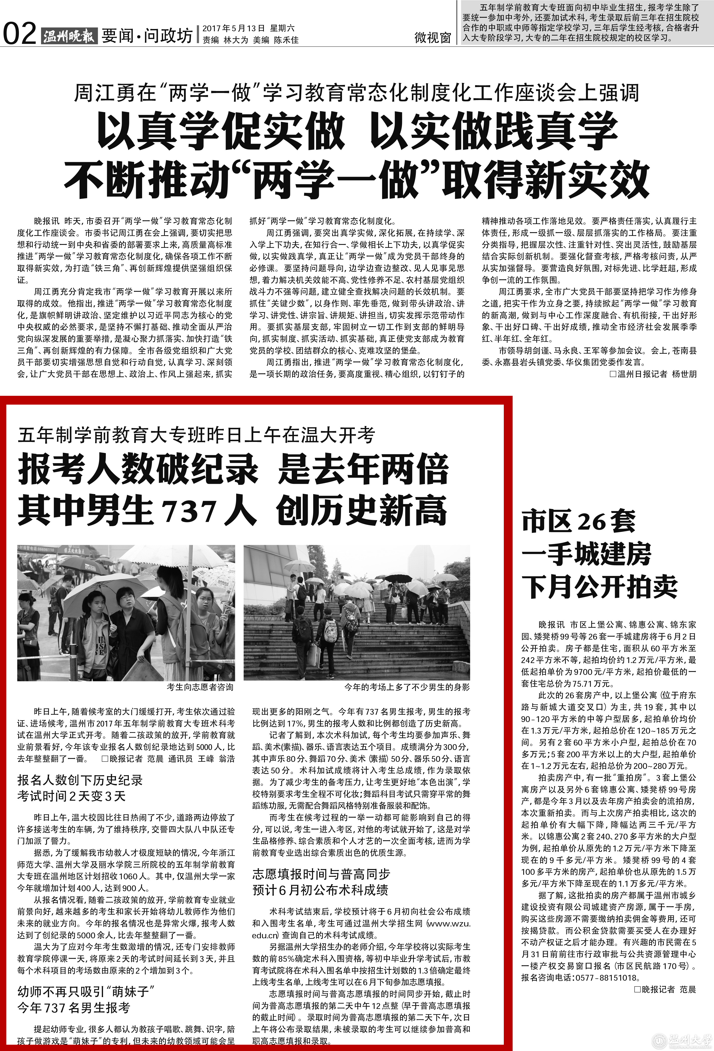 昨日上午,随着候考室的大门缓缓打开,考生依次通过验证、进场候考,温州市2017年五年制学前教育大专班术科考试在澳门银河官网 正式开考。随着二孩政策的放开,学前教育就业前景看好,今年该专业报名人数创纪录地达到5000人,比去年整整翻了一番。