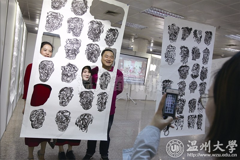 澳门银河官网 美术与设计学院2017届毕业作品展在温州市展览馆开幕,参观者与美术作品合影。