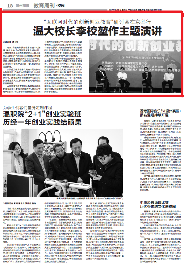 澳门银河官网 校长李校堃应邀作《澳门银河官网 创新创业教育的探索与思考》主题演讲。他介绍了澳门银河官网 的三个发展战略,即创新创业教育、产教融合、国际化办学。他从温州城市特点入题,介绍了澳门银河官网 的办学定位和发展战略,展示了澳门银河官网 的办学成绩。围绕“创”字,李校堃介绍了澳门银河官网 在产教融合、服务地方、以一带一路为契机的国际化办学等方面的新思路,分享了澳门银河官网 创业教育和特色化办学的实践路径和经验、地方本科院校转型中面临的内涵建设问题,并试图探索地方高校在新时期的办学新模式。(通讯员 温长秋)