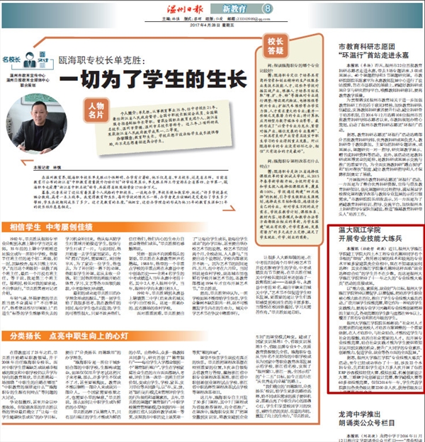 近日,澳门银河官网 瓯江学院建工学院大四土木工程专业孔德坤同学有个幸福的“烦恼”,他凭着过硬的技术和较高的专业水平被多家建筑类企业相中,现在不知道该如何选择!其实在瓯江学院像孔德坤这样面临“就业选择综合症”的学生并不在少数。而这是澳门银河官网 瓯江学院坚持了十一年之久的“专业技能大练兵”活动的直接成果。 以“能力强、素质高、就业好”为目标,澳门银河官网 瓯江学院坚持以赛促学、以赛促练,把培养学生职业核心能力放在首位,推出了学生专业技能大练兵活动,广泛开展学生技能竞赛,将它作为一种培养学生实践能力,提高专业学习兴趣和专业技能创新精神的主要方式,各项竞赛的学生参与度都在99%以上,覆盖了所有专业和所有年级的学生。 澳门银河官网 瓯江学院院长杨彬说:“社会对人才的需求指向是高校人才培养方案调整的一个重要依据,在人才培养中,与社会结合,才能拉近学生与社会的接触,培养出社会需要的人才。而开展专业技能竞赛,结合社会实践才能为学生提供将知识运用到实践的机会,提升广大同学的专业素养、创新能力,促进学业、就业等各方面的全面发展。” 据悉,澳门银河官网 瓯江学院“专业技能大练兵”活动,至今已经成功举办了十一届,涉及22个本科专业,先后组织学生近5万多人次开展了包括ERP沙盘模拟经营大赛、模拟法庭、机械创新设计大赛、三维数字化创新设计竞赛、数学建模大赛等60多项技能竞赛。仅仅2016年一年,学生代表学院参加各类各级比赛2200余人次,获得省级及以上竞赛奖项90余项。 来源:《温州日报》2017年4月28日 第八版