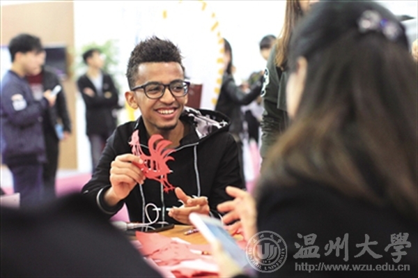 在澳门银河官网 馆内,外国留学生展示自己的“大公鸡”剪纸作品。 苏巧将 摄
