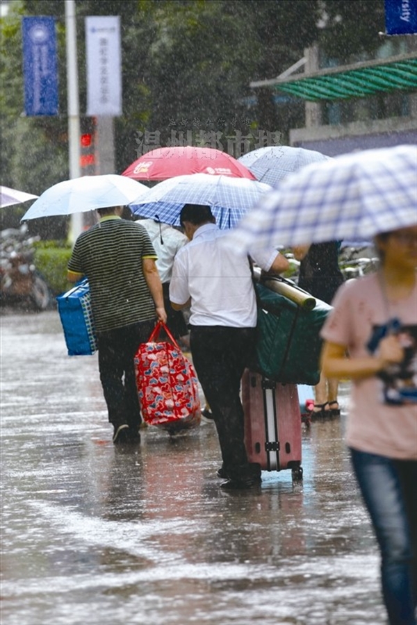 2016-09-12 银河 新生雨中报到,有家长陪同孩子前来,帮忙提行李。