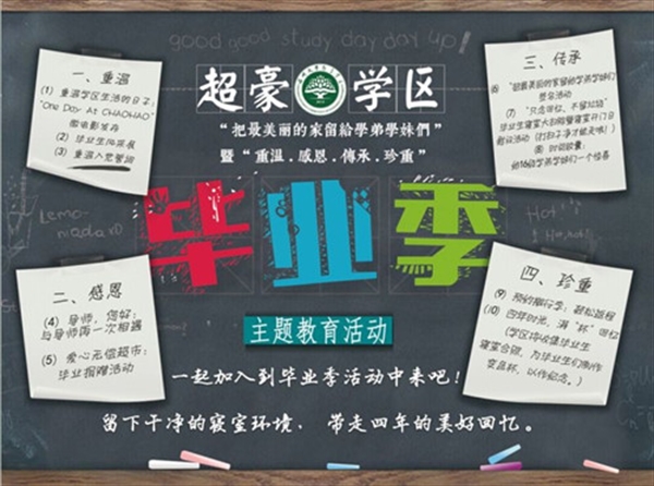 “轻轻地,我走了,不留下一片垃圾。”这是超豪学区的5号楼的楼栋LED近日打出的一行字,它提醒着每一个即将离校的毕业生,文明离校,温暖离校,把最美的寝室留给学弟学妹。学区还特别举办了“只念回忆、不留垃圾”毕业生寝室大扫除活动,毕业生寝室开门日活动等。学区制建设以来,“文明修身”一直是学区上下,齐抓共管的一件事。超豪学区专门成立了一支由学生党员担任主力的楼栋学生组织——公寓自我管理委员会(简称“自管会”),设计人性化、常态化的寝室文明督查建设方案和活动方案。楼栋“诚信超市”等融育人和服务于一体的平台广受赞许。四年下来,这里的学生养成了文明、整洁的习惯。这种习惯在毕业季传播着、传承着。