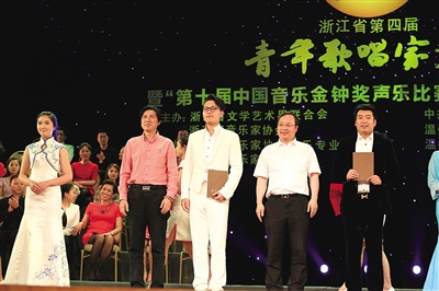 本报讯 (记者 伍秀蓉) 伴随着《我爱你中国》的熟悉歌声响起,省内最专业的声乐大赛——浙江省第四届青年歌唱家大赛暨“第十届中国音乐金钟奖声乐比赛浙江赛区选拔赛”昨晚在鹿城文化中心落下帷幕,来自浙江歌舞剧院的金瑶、杭州歌舞剧院的张玉芳分别获得民族组和美声组金奖,并获得了直通中国金钟奖复赛的资格。我市音协选送的歌手李勇君获得了民歌组银奖,陈波、易志雄、史海珍、刘婕获得优秀奖。